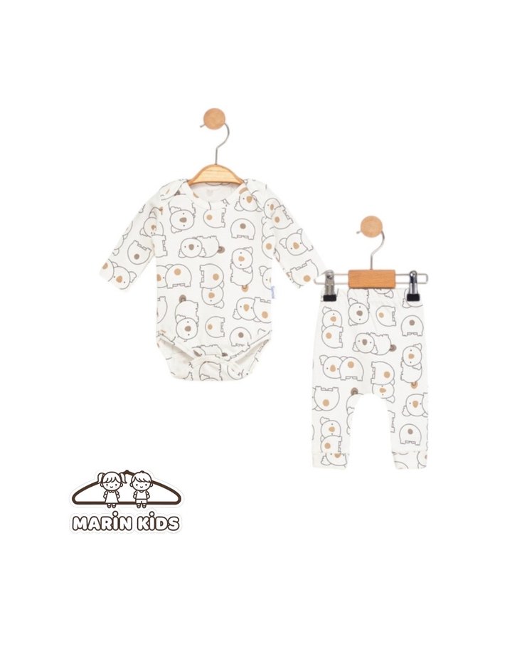 Pamuklu, uzun kollu ve yuvarlak yakalı beyaz bebek takımı, yumuşak dokulu örgü kumaş ve sevimli baskılı desene sahip. Koala detaylı ikili takımımız 0-3 3-6 6-9 ay seçenekleri ile stoklarımızda mevcuttur.