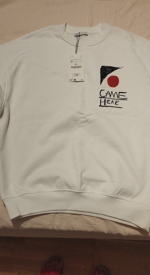 Beyaz pamuklu sweatshirt, yuvarlak yaka ve uzun kollu, bol kesimdir. "CAME HERE" yazılı baskı ile günlük rahat ve şık stil sunar.
