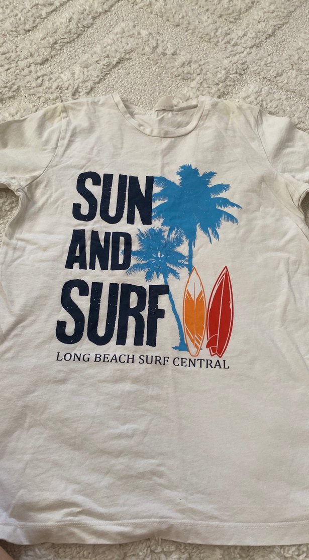 Pamuklu, kısa kollu, yuvarlak yakalı ve bol kesim erkek tişörtü. Üzerinde palmiye ağaçları ve sörf tahtaları baskısı ile 'SUN AND SURF LONG BEACH SURF CENTRAL' yazısı bulunur.