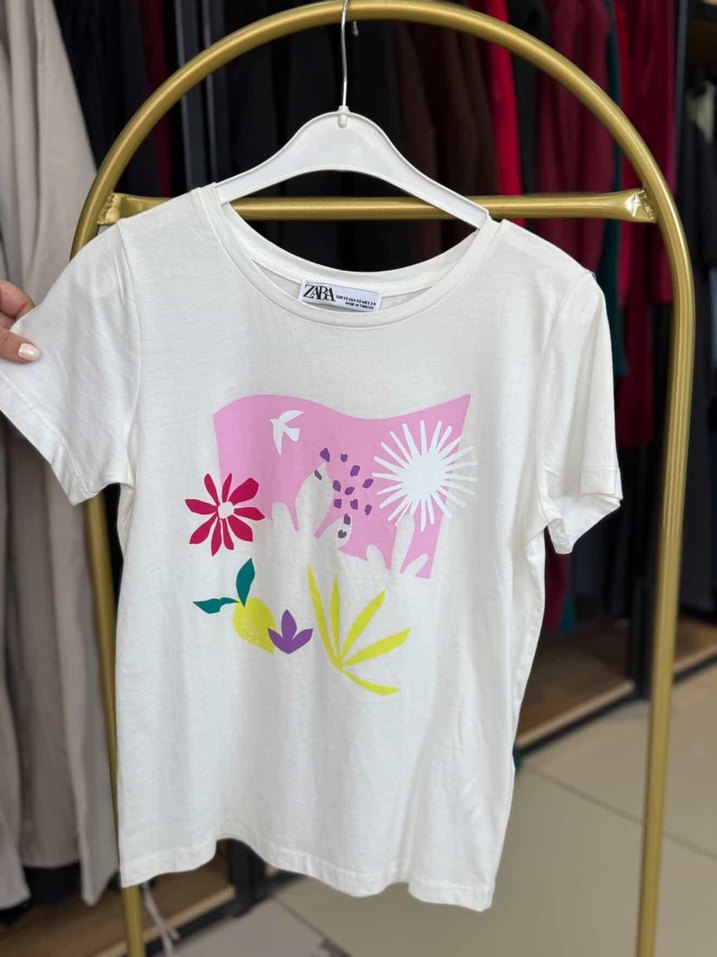 Beyaz pamuk kumaştan, kısa kollu ve bol kesim kadın tişörtü. Önünde renkli baskılı desen ve yuvarlak yaka bulunur, günlük rahat kullanım için uygundur.