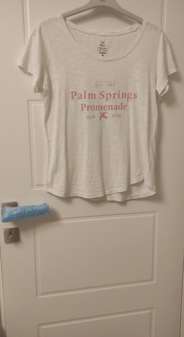 Beyaz pamuklu, kısa kollu, yuvarlak yaka, bol kesim tişört. Üzerinde pastel pembe "Palm Springs Promenade SUN FUN" baskısı bulunur. Sokak stiline uygundur.