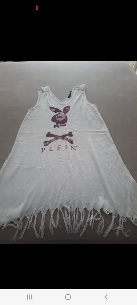 Beyaz pamuklu, baskılı rock punk desenli, püsküllü ve salaş kesime sahip plaj elbisesi L beden