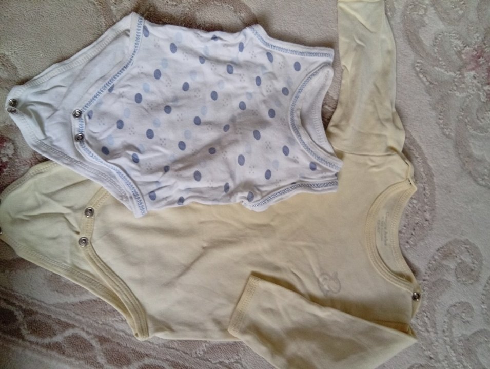 Yumuşak pamuktan beyaz askılı bebek body, yuvarlak yakalı ve düğmeli. Pastel tonlarda hafif puantiyeli desenlidir.