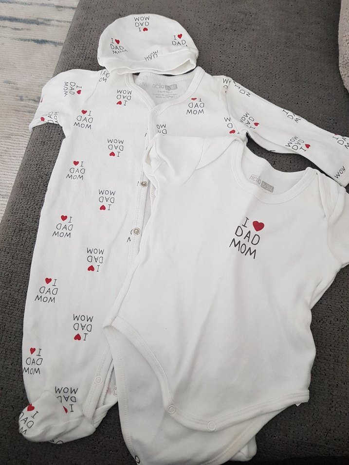 Pamuklu, beyaz renkli bebek hastane kıyafeti seti. Uzun kollu düğmeli tulum, body ve şapka üzerinde "I ❤️ DAD MOM" baskısı bulunur.