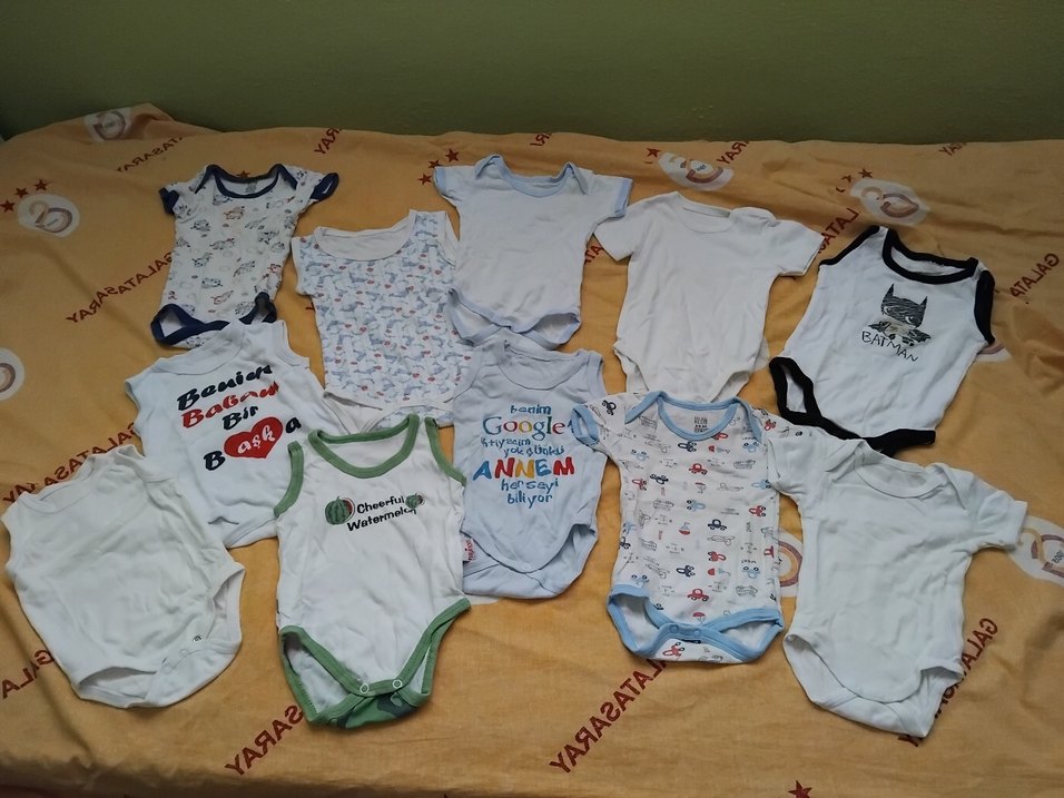 Beyaz pamuklu, kısa kollu, baskılı ve yuvarlak yakalı bebek body, rahat ve şık tasarım sunar. 11 adet zıbın. Poşet lekeleri mevcut