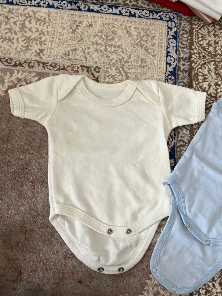 Beyaz renkli, pamuklu kumaştan yapılmış kısa kollu, yuvarlak yakalı bebek body. Alt kısmında çıtçıtlı kapama bulunur.