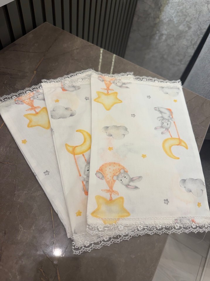 ADET FİYATI 40 tl dir.Beyaz pamuklu bebek omuzları örtüsü veya ağız silme bezi olarakda kullanıma uygundur .Pastel renkli yıldız, ay, bulut ve tavşan desenleriyle süslenmiş, dantelli kenarlı.