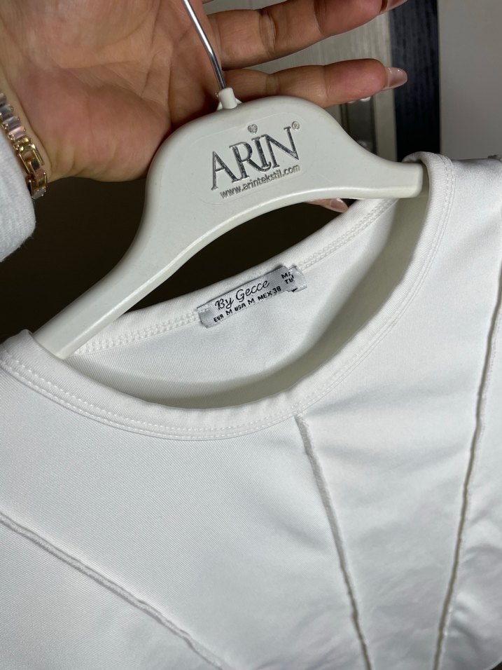 Pamuk kumaştan, dar kesim, yuvarlak yaka ve uzun kollu beyaz hamile tişörtü. Kısa boyu ve baskılı deseniyle sokak stiline uygun, parlak görünüm sunar.