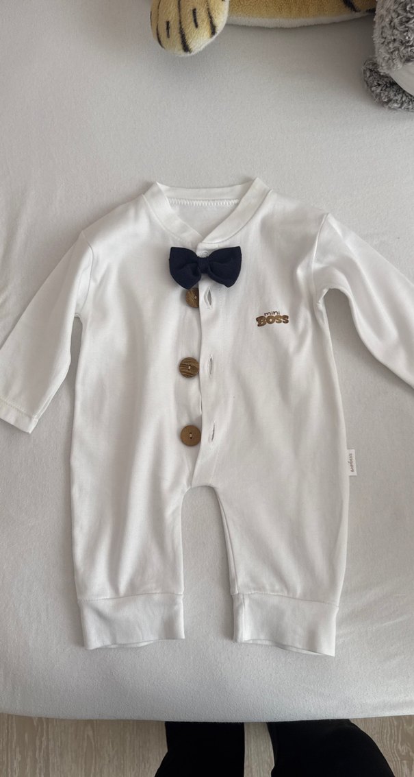 Düğmeli, uzun kollu ve yakalı beyaz pamuklu erkek bebek tulumu. Küçük papyon detayı ile rahat normcore tarz sunar. Bir kere giyildi. ufak lekesi var fotoğrafta görünüyor. Ben çıkartmak için birşey kullanmadım..