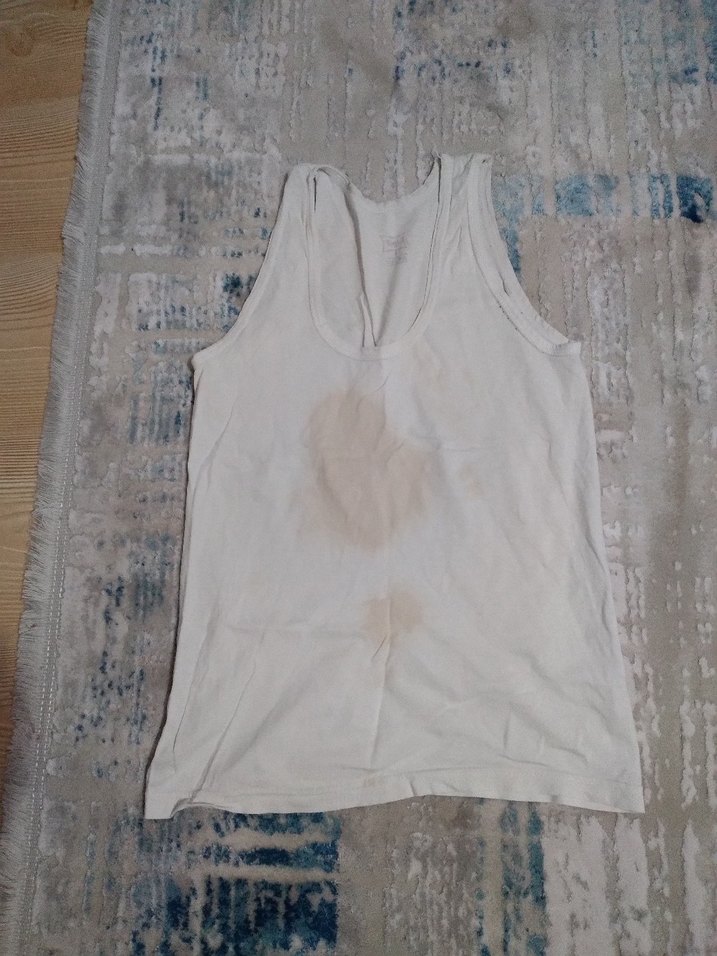 Beyaz pamuklu, salaş kesim, bisiklet yaka ve kolsuz tasarıma sahip atlet, günlük kullanım için uygundur. Tutku markası. 6 numara.uzrindendeki leke çay lekesi.onun için uygun verecegim.