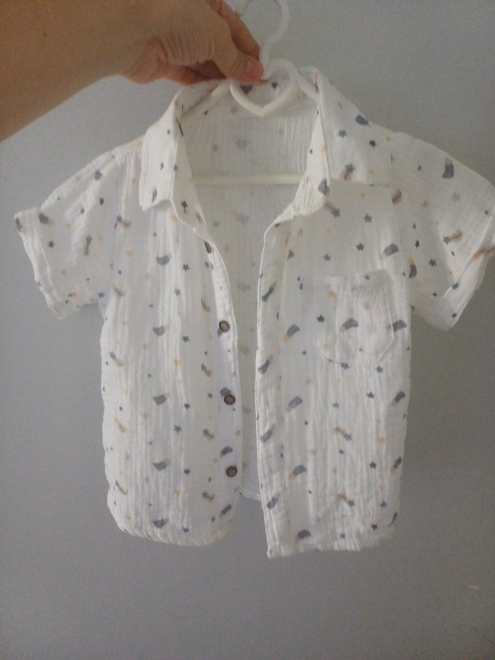 Beyaz pamuklu erkek çocuk gömlek, kısa kollu ve düğmeli. Gevşek kesim, yakalı ve pastel baskılı desene sahip.