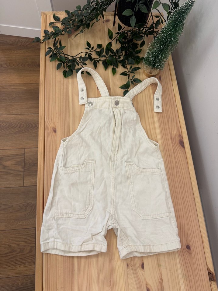 Ayarlanabilir askılı, ön cepli beyaz pamuklu erkek çocuk tulumu, rahat kesim ve pastel tonlarda sokak stili sunar.
