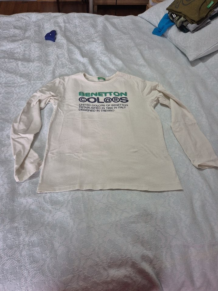 Kırık beyaz pamuklu kumaştan üretilmiş, uzun kollu ve baskılı desenli erkek çocuk tişörtü. Salaş kesimi ve bisiklet yaka ile rahat ve şık bir görünüm sunar. Bedeni: 168 cm. 13-14 yaş. Boyu 61cm., eni 44 cm. 2-3 defa giyildi. Yepyeni.