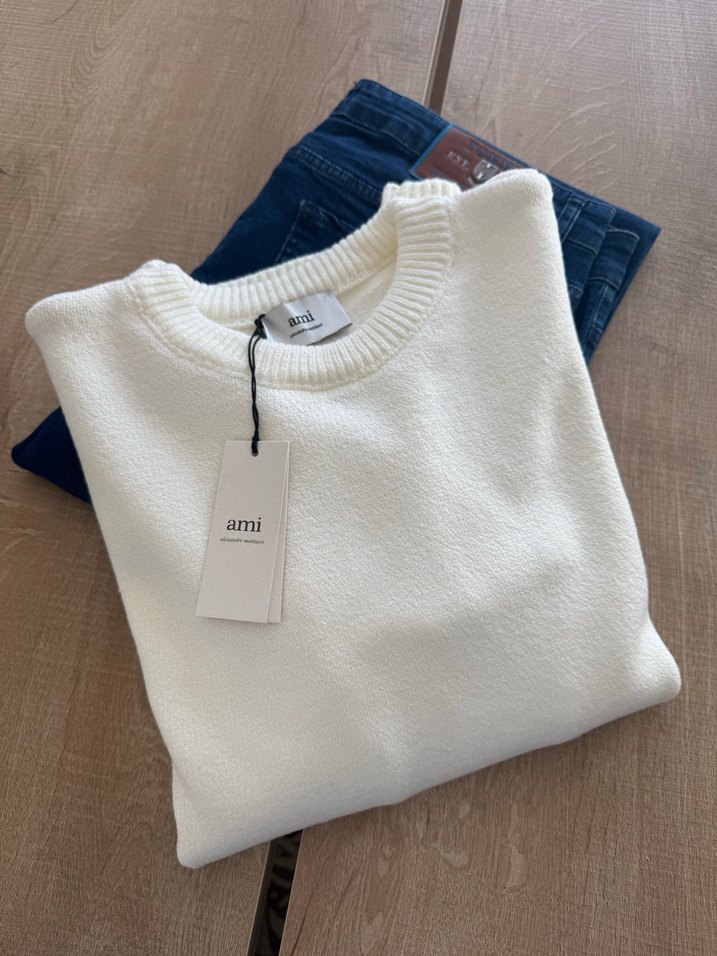 Bu beyaz pamuklu kazak, örgü dokusuyla crew neck ve uzun kolludur. Salaş kesimi ve normal uzunluğu ile gündelik sokak stiline uygundur. Desensiz yapısı günlük kullanıma uygundur, AMI marka etiketlidir.