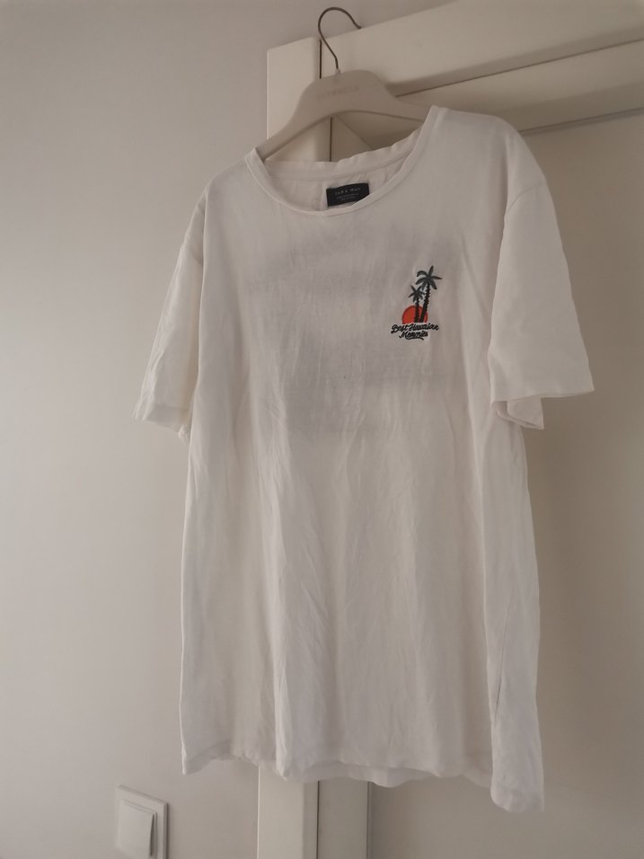 Beyaz pamuklu erkek tişört, oversize kesim ve kısa kollu. Önünde palmiye ağacı baskısı bulunur, plajda rahat kullanım için uygundur.