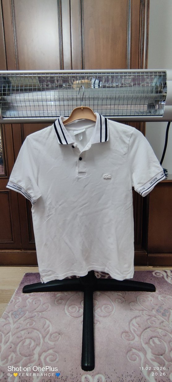 Beyaz, pamuklu, kısa kollu, düğmeli, yakalı ve vücuda oturan erkek polo tişörtü. Rahat sokak giyimine uygundur.