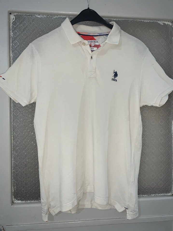 Pamuklu beyaz renk, kısa kollu, düğmeli yakalı ve normal boyda erkek polo tişört. Günlük rahat kullanım için uygundur.