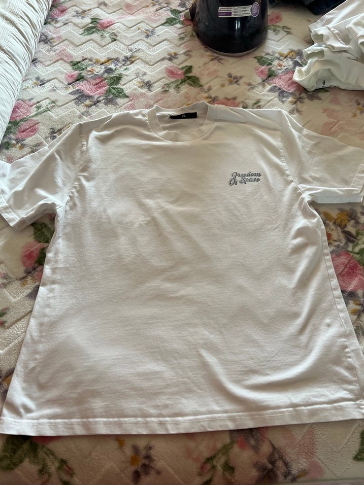 Beyaz pamuklu erkek tişört, kısa kollu ve rahat kesim. Baskılı desenli, günlük kullanım için uygun, bisiklet yaka ve normal boyda.