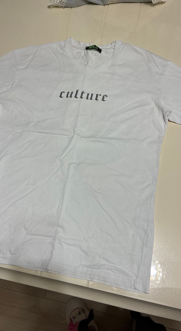 Erkek tişörtü, kısa kollu ve yuvarlak yakalı, pamuklu ve bol kesimdir. Beyaz renkte olup önünde gri 'culture' baskısı bulunur. Günlük rahat kullanım için uygundur. beden 54. boy 72