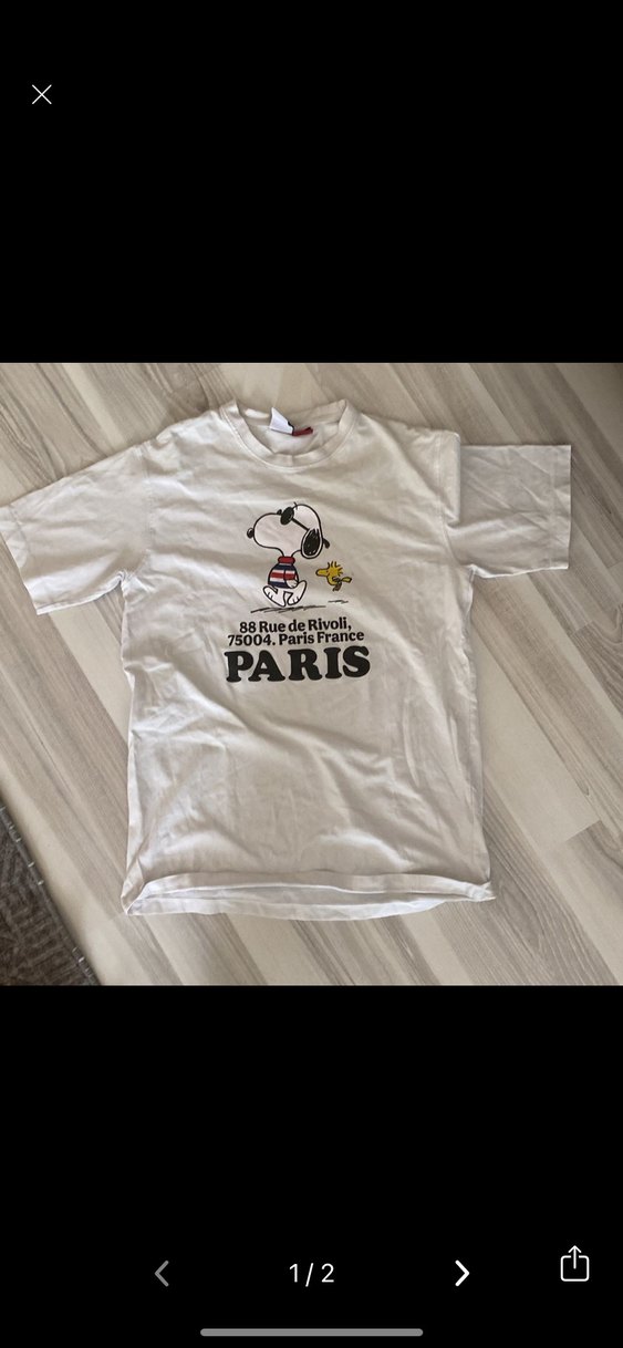 Beyaz pamuklu, kısa kabartmalı kollu kız tişörtü. Snoopy baskılı, Paris yazılı, bol kesim ve yuvarlak yaka, rock punk havasında.