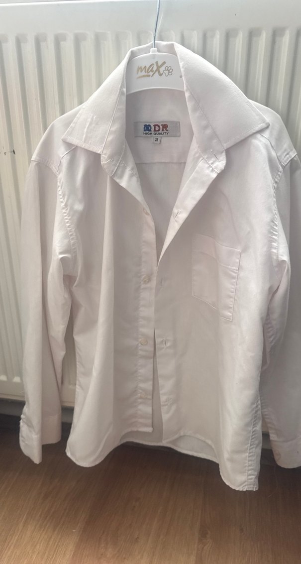 Beyaz, uzun kollu, pamuklu erkek gömlek. Düğmeli ve yaka detaylıdır, rahat kesim ve parlak görünüme sahiptir.