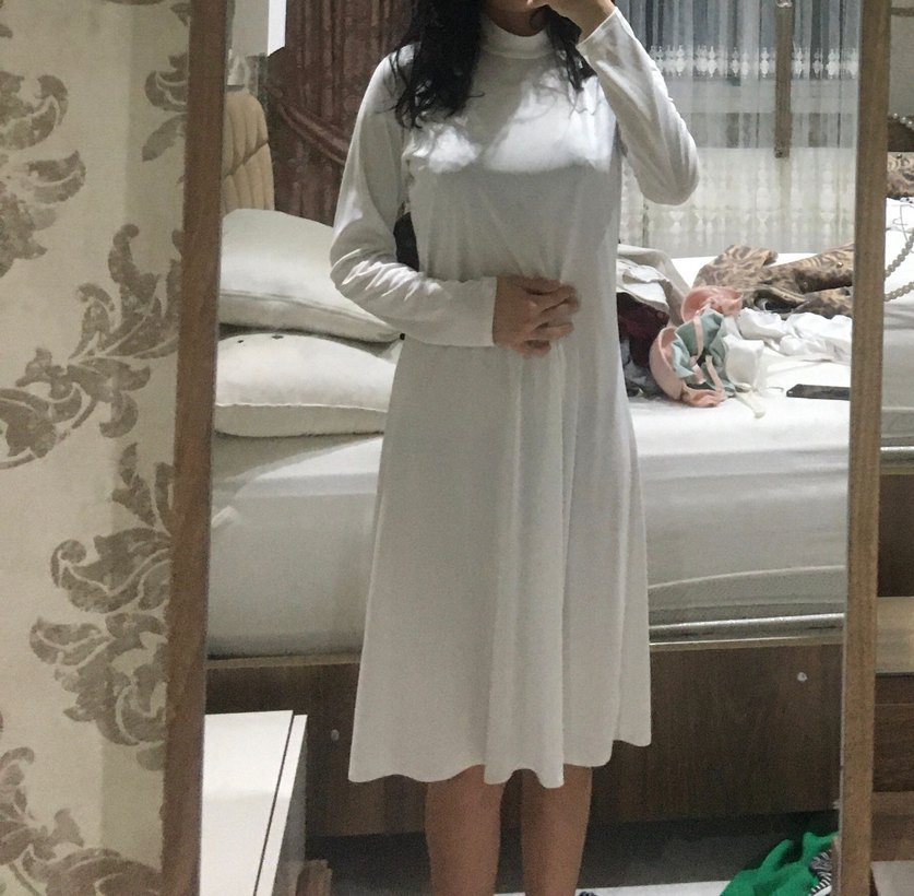 Beyaz pamuklu hamile elbisesi, uzun kollu ve yüksek yakalıdır. Rahatlık için bol kesimdir, minimal desen içermez ve günlük kullanıma uygundur.