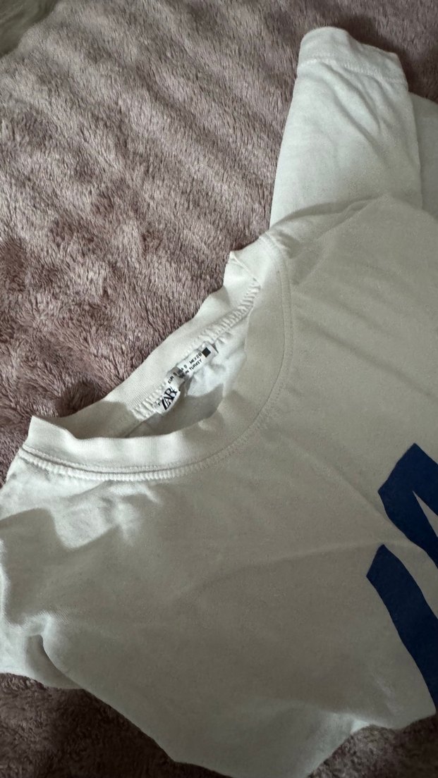 Kısa kollu, yuvarlak yaka beyaz tişörtü. Gri baskılı, gevşek kesim ve normal boyda, Velcro detaylıdır. .