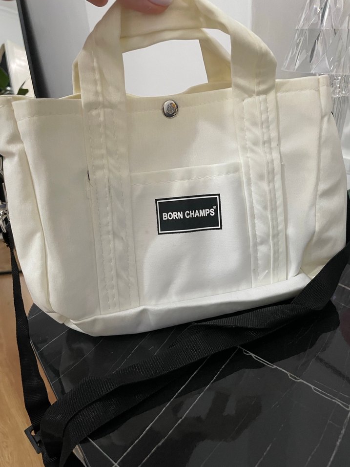 Pamuklu beyaz kadın çanta, tokalı tasarım ve 'BORN CHAMPS' baskılı logo içerir. Minimalist normcore stilde, günlük kullanım için uygundur. Ürün fazlalığı