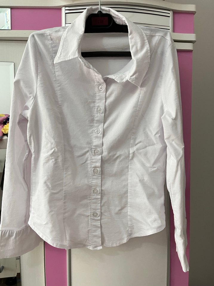 Beyaz pamuklu kadın gömlek, yakalı, uzun kollu ve düğmeli tasarıma sahiptir. Ofis için uygun, vücuda oturan normal boyda bir gömlektir.