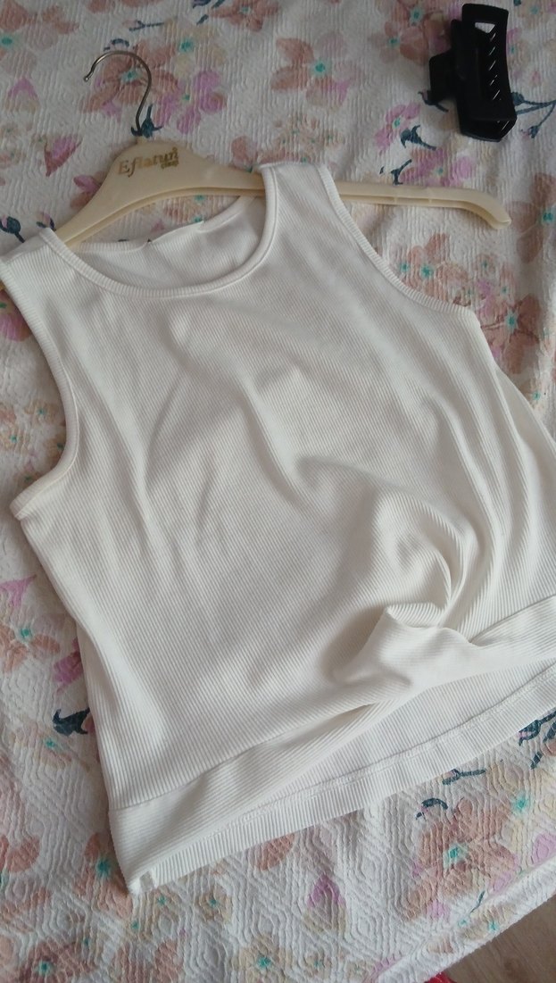Beyaz, pamuklu ve kolsuz bu tişört, yuvarlak yakalı ve bol kesimdir. Normal uzunlukta, desensiz ve günlük kullanıma uygundur.