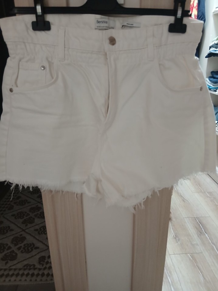 Beyaz pamuklu mini denim şort, bol kesim ve püsküllü kenar detayına sahip. Kemeriyle tarz katıyor, günlük sokak stili için uygun.