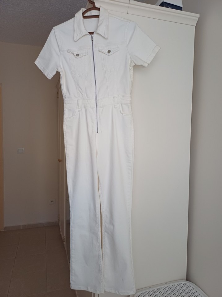 Beyaz pamuklu kumaştan, kısa kollu ve kesik yaka detaylı, uzun paçalı regular fit tulum. Desensiz ve rahat, gündelik şıklık sunar. L beden ama m ve s beden gibi