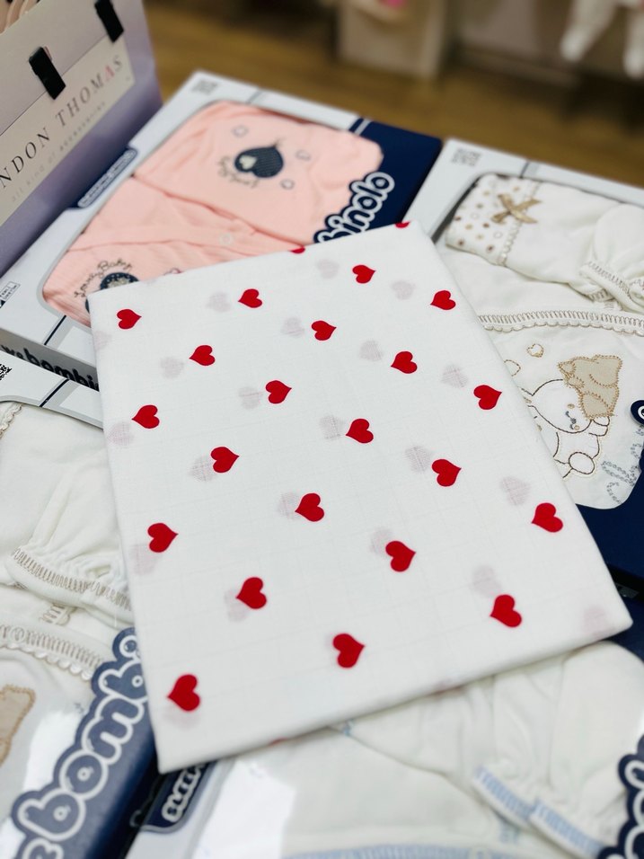 Yumuşak ve nefes alabilen kumaştan, kırmızı ve gri kalp desenli beyaz pamuklu çocuk müslin örtü