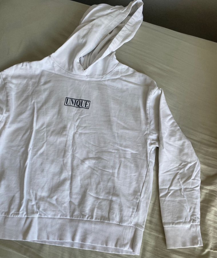 Uzun kollu, kapüşonlu beyaz sweatshirt, yumuşak keten kumaştan, önünde "UNIQUE" baskısı bulunur. Sokak stili ve athleisure tarzını yansıtır.