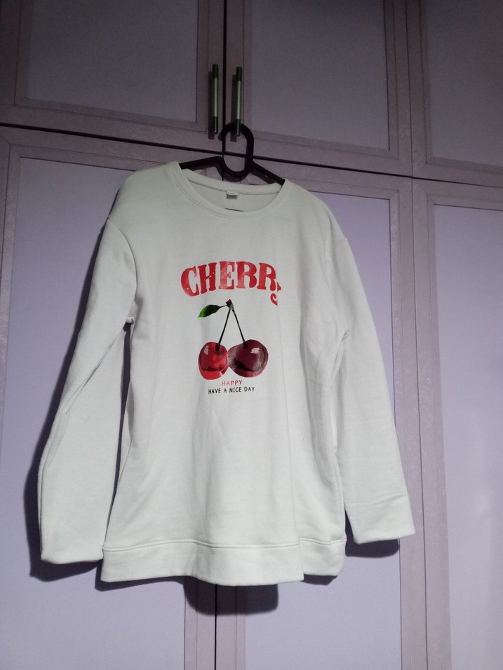 Beyaz pamuklu, uzun kollu ve yuvarlak yakalı bu rahat kesim sweatshirt, önünde 'CHERR.' yazılı kiraz baskısı ile günlük sokak stiline uygundur. bı kez giydim