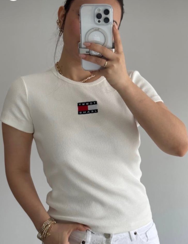 Pamuklu, kısa kollu, bisiklet yaka, göğüste küçük baskılı logo bulunan, rahat ve şık beyaz kadın tişörtü.