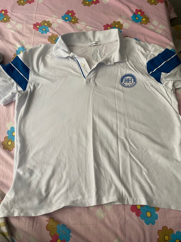 beyaz pamuklu kısa kollu polo tişört, düğmeli yakaya ve kolarda mavi baskılı çizgilere sahiptir. Rahat günlük kullanım için bol kesimdir.