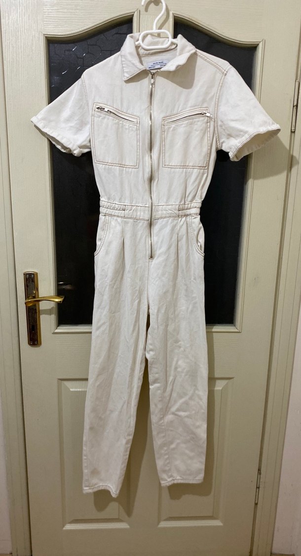 Beyaz pamuklu tulum, kısa kollu ve yüksek yakalıdır. Fermuarlı önü ve vücuda oturan kesimiyle günlük sokak stiline uygundur. ✨ Boy . 140