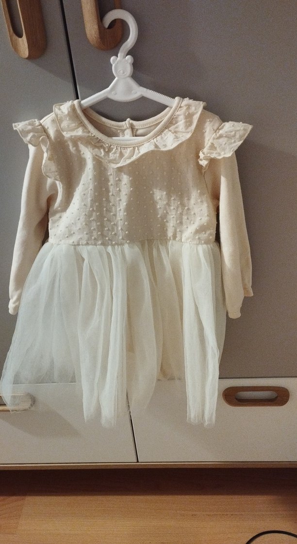 Uzun kollu, bol kesim ve yuvarlak yakalı kız çocuk elbisesi. Pamuklu, fırfırlı detaylı, bohem etek kısmı tül kaplı, pastel beyaz renkte klasik şıklık için uygundur.