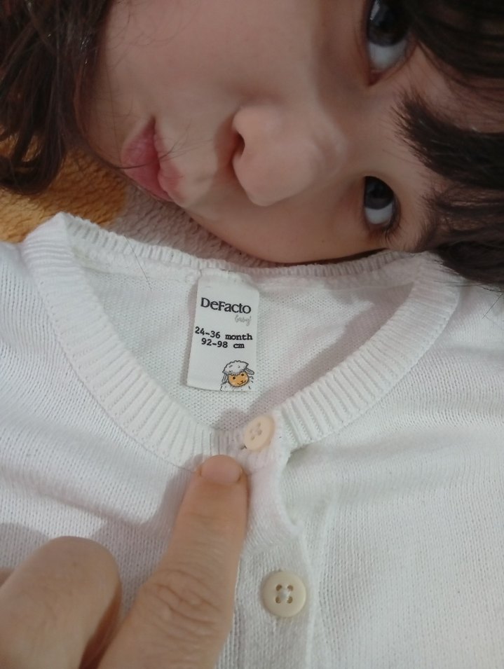 Bu beyaz pamuklu hırka, düğmeli ön kısmı ve uzun kollu tasarımıyla rahat bir kullanım sunar. DeFacto markasına ait, hafif desenlidir.