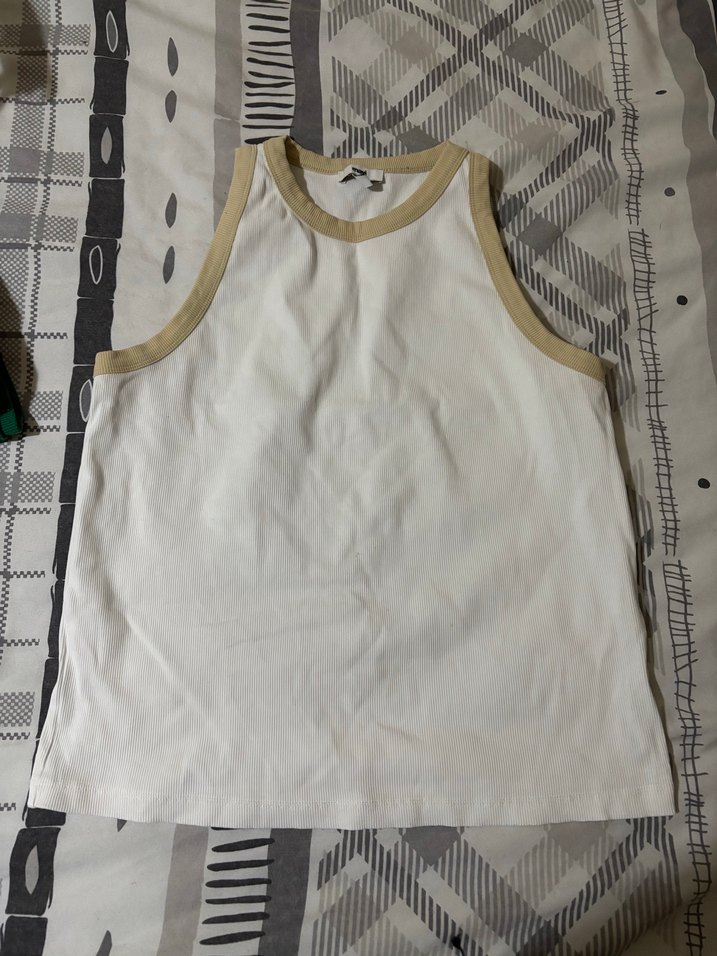 Beyaz pamuklu kolsuz atlet, bej kenar detaylarıyla sade ve basic bir tarz sunar, günlük kullanım için uygundur.