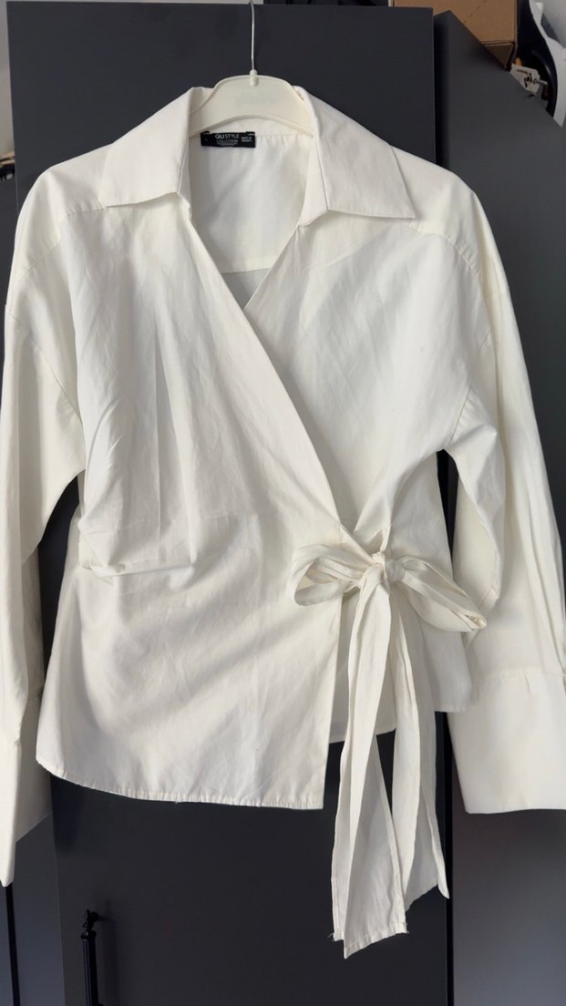Beyaz pamuklu gömlek, yakalı ve uzun kolludur. Kuşak detayıyla belden bağlanır, desensizdir.