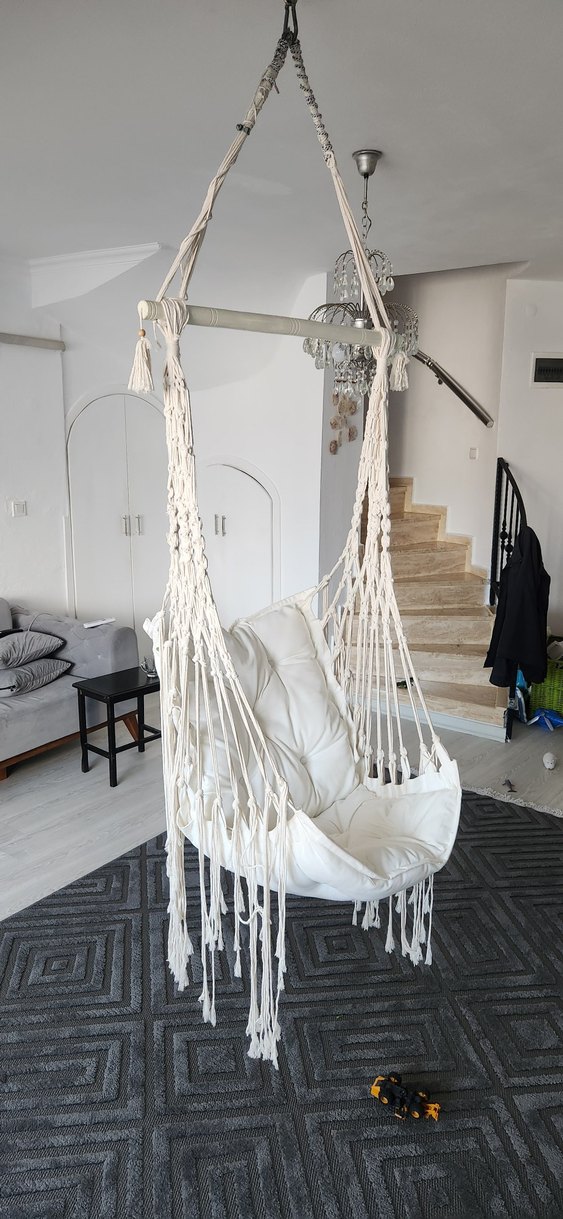 Yumuşak yastıklı beyaz pamuklu makrome salıncak, konforlu iç mekan dinlenmesi için. Dayanıklı asma ipleri ve dekoratif püsküller içerir.
