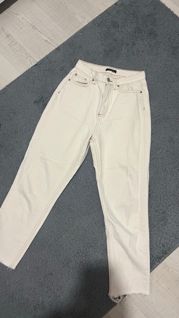 Beyaz pamuklu kumaştan, normal boy midi uzunluğunda, rahat kesimli kadın jean. Günlük kullanıma uygun, desen içermeyen pastel ve şık bir tasarım.