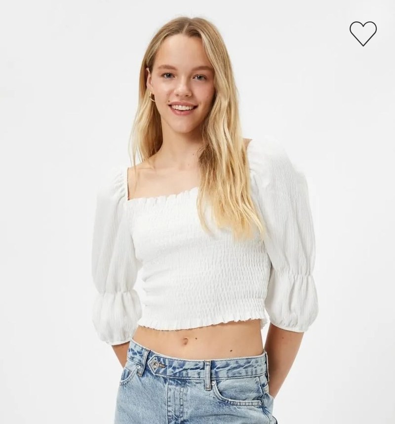 Beyaz pamuklu bluz, tekne yaka ve kısa kabarık kollara sahiptir. Salaş kesim ve mini boyda, günlük kullanım için uygun, trend sokak stili.
