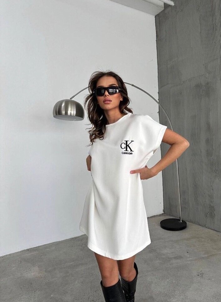 Beyaz pamuklu kumaştan, kısa kollu ve bol kesim mini elbise. Bisiklet yaka ve hafif baskılı logo ile rahat ve şık görünüm sağlar.