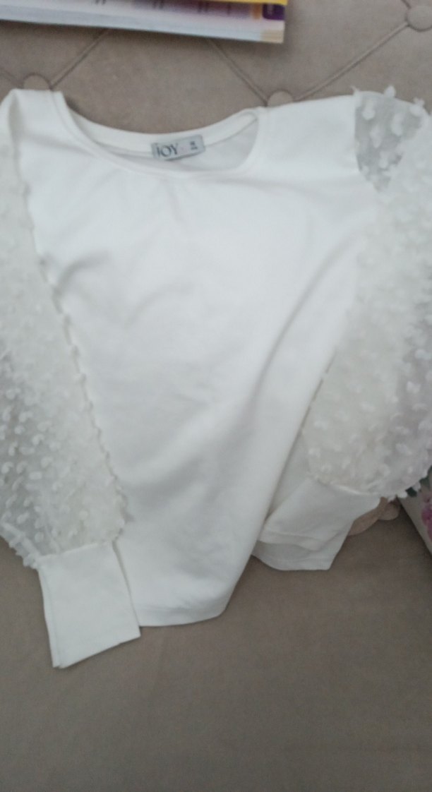 Beyaz pamuklu kumaştan, yuvarlak yaka ve uzun fırfırlı kollu, bol kesim mini bluz. Günlük kullanıma uygun rahat bir parça.