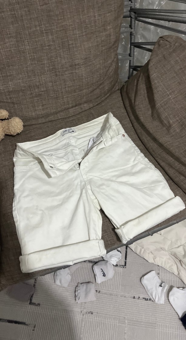 Beyaz pamuklu, kısa boy, dar kesim ve kıvrımlı paçalarla rahat ve şık mini şort.