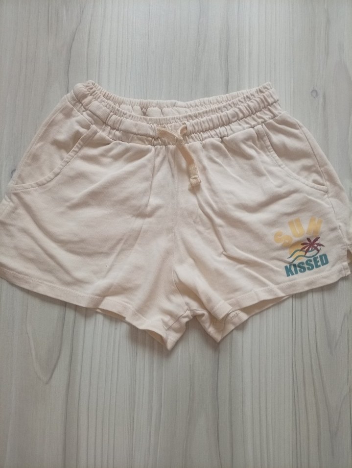 Beyaz pamuklu mini şort, rahat kesim ve lastikli bel detayına sahip. Yan cepleri ve renkli 'KISSED' baskısıyla plaj için uygun.