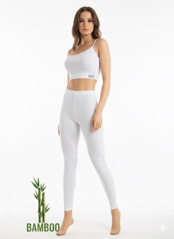 Pamuklu, kısa beyaz tayt, düz desensiz ve dar kesim. BAMBOO etiketiyle spor için rahat ve şık bir tercih.